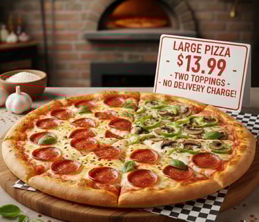 $13.99 Large 2-Topping Pizza Special! Call 888-714-6364 to Order. NOTICE: 100% Cashless Service - We only accept Credit/Debit cards over the phone for secure processing and driver safety.