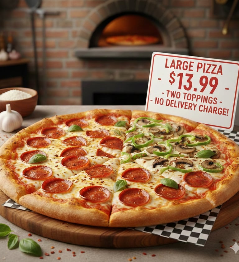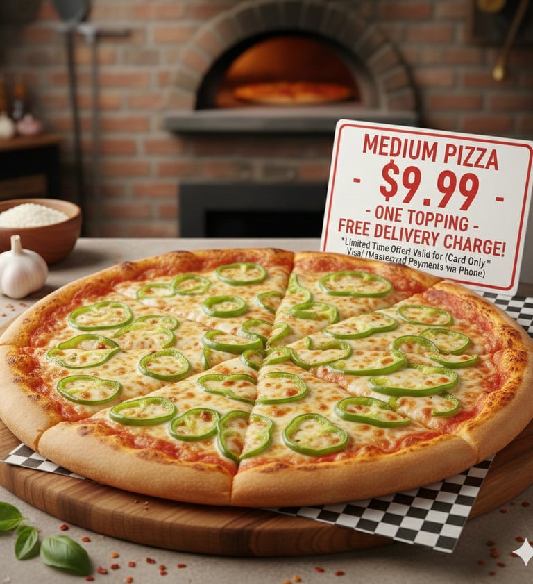 The Special deal of a large 2-topping pizza for 13.99 is exclusively for customers paying with visa or mastercard over the call